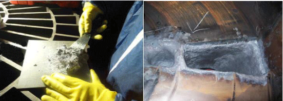 1.先預熱已噴砂的設備,再將RJ-C-16耐磨修復材料A、B組份按比例混合攪拌均勻,涂覆于設備磨損部位,并使用刮板將涂層表面處理平整、光滑;