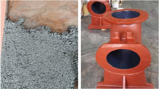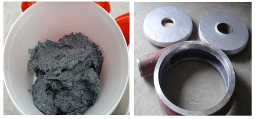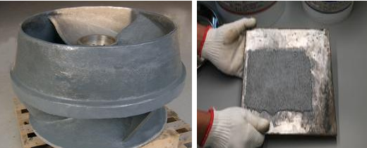 ( 1 )表面處理:在設(shè)備耐磨防腐修復(fù)之前,對于設(shè)備修復(fù)面要做表面處理工藝,在除油除潮后,以角磨機(jī)或噴砂方法將待修補(bǔ)表面處理成均勻的粗糙表面,以增強(qiáng)修補(bǔ)材料與修補(bǔ)表面的粘結(jié)力強(qiáng)度。